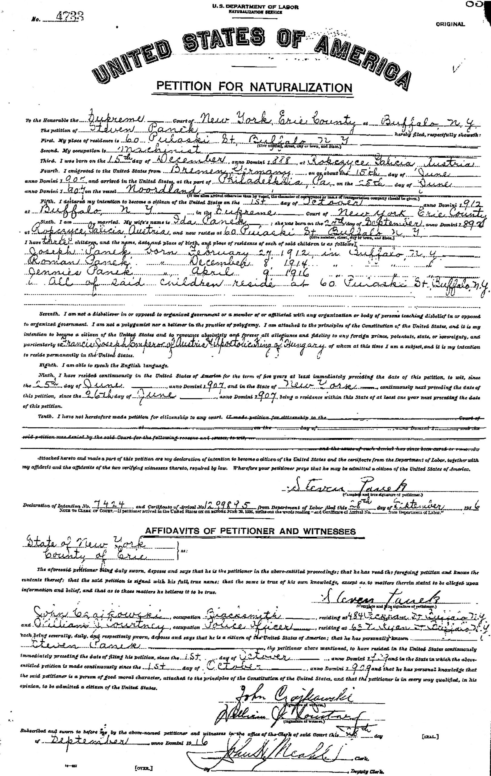 ​Stephen petitioned for naturalization and received his citizenship on October 1, 1912.