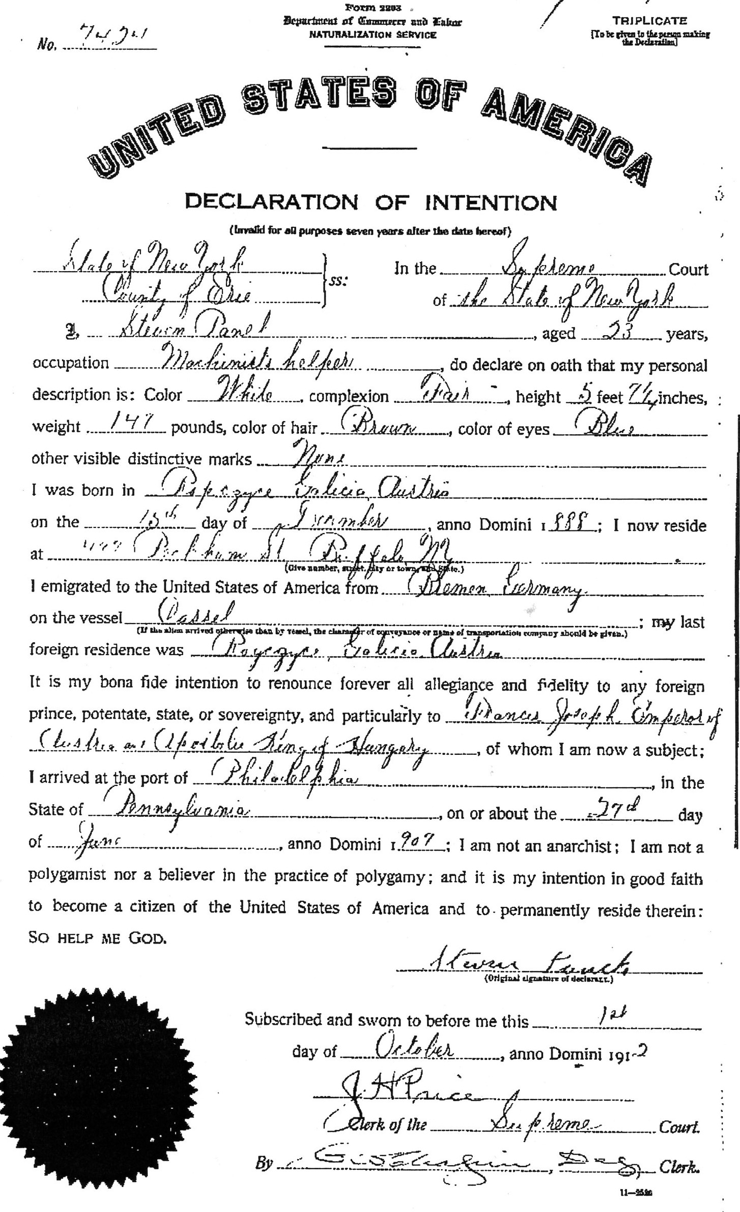 After a ten day journey out of Poland, through Germany, across the North Sea to Liverpool, England, and  then across the Atlantic to the United States, he arrived at the port of Philadelphia on June 25th, 1907.  He was sponsored/received in the US by his Uncle Jan Bursztyn , brother to his mother Katarzyna Bursztyn-Panek.